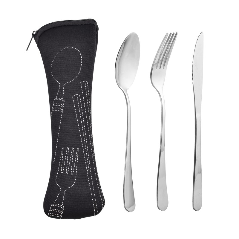 - Package Includes: Our travel silverware sets includes 1 dinner knife, 1 dinner fork,1 dinner spoon and a portable cloth bag. Giving you everything you need to fully enjoy all of your meals while on vacation, at the office, or at home.