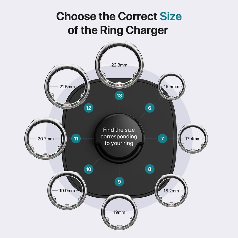 - Choose the Correct Size: Each of our smart ring charger sizes corresponds to the size of your ring. For a more perfect charging experience, please carefully check the size of your smart ring and select the appropriate charger size