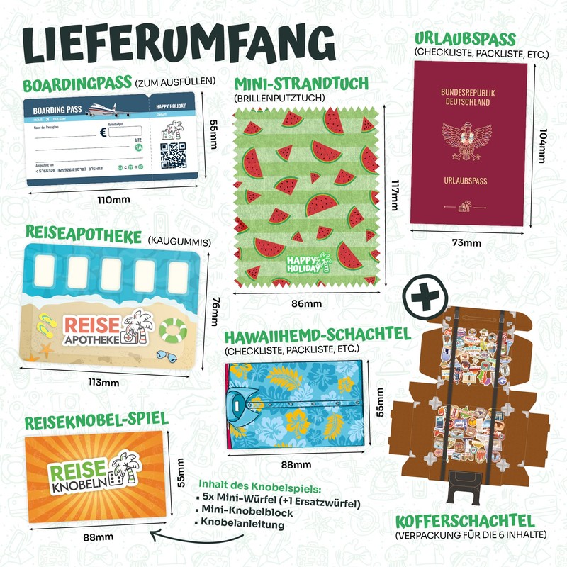 In our carefully assembled set you will find a stylish Hawaiian shirt box for money gifts, complemented by practical travel accessories such as a travel pharmacy (chewing gums) for all eventualities, a mini beach towel (for cleaning the sunglasses), an inspiring holiday pass full of valuable information and travel tips, a fun travel puzzle game with puzzle block and dice and a personalised boarding pass as a gift card.