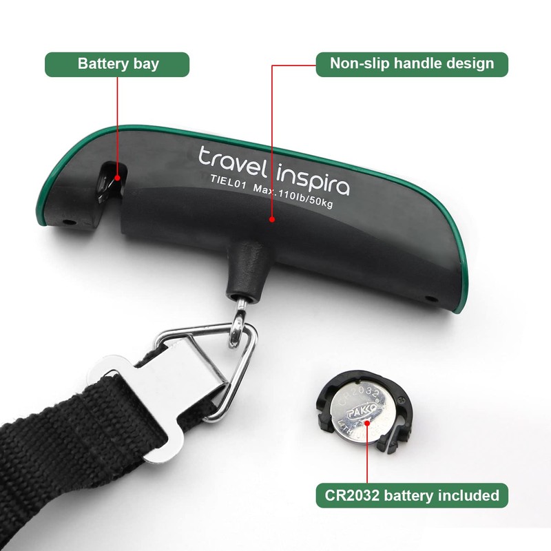 travel inspira Luggage Scale, Portable Digital Hanging Baggage Scale for Travel, Suitcase Weight Scale with Rubber Paint, 110 Pounds, Battery Included - Green
