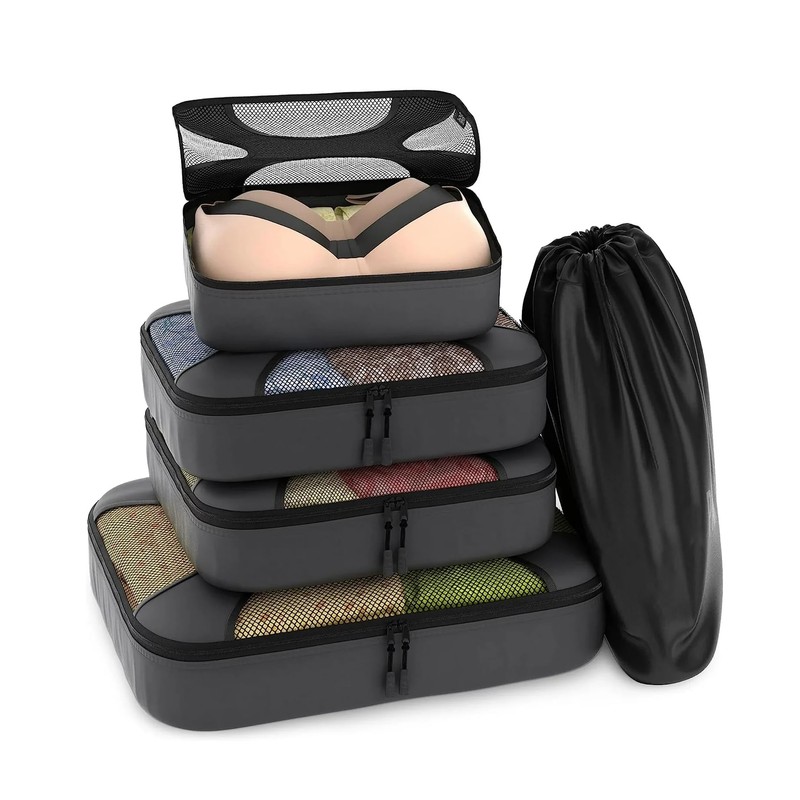 Travel Mesh Organizer 5 Piece Packing Cube for Luggage Suitcase With Laundry Bag (Grey)