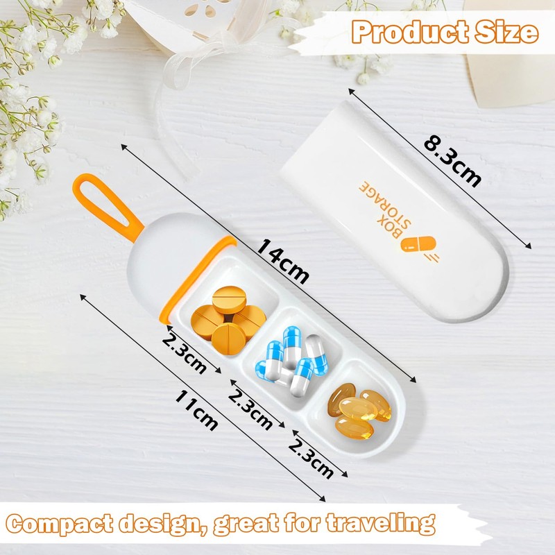 Travel Pill Box, Small Pill Box Daily Pill Pot BPA Free Pill Case Stylish Pill Box Small Pill Container with Slide Design 3 Compartment Mini Pill Box for Supplements, Vitamins (White/Orange)