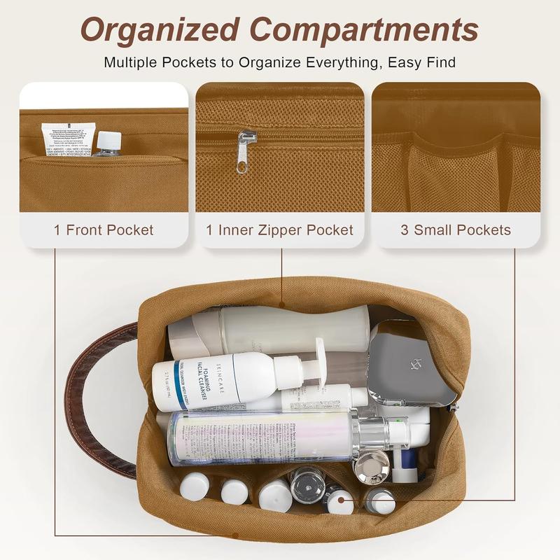 material: The travel toiletry bag is made of water-resistant sturdy & wearable quality polyester and PU leather material that has no unpleasant smell. These make the bag itself very well-constructed to keep the shape, durable, easy to wipe clean and protect your toiletries from splashed water