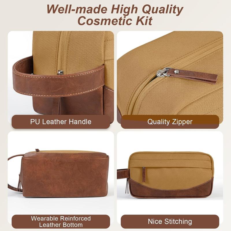 Portable design: Leather handle makes the Dopp kit for toiletries easier to carry and hang, reinforced bottom with leather makes it wearable. The combination of zipper & zipper ear makes it easier to hold and zip up and down. This toiletry bag is in a size that can be packed up and tucked away in the suitcase