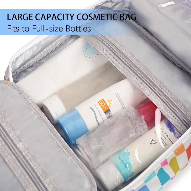 - Easy to Hang and Carry - The sturdy non-slip metal hook for versatile hanging options. Sturdy PU leather handle makes the travel toiletry bag easier to carry. The lightweight travel makeup bag won't put an extra load on your luggage. It fits neatly inside suitcases and bags.