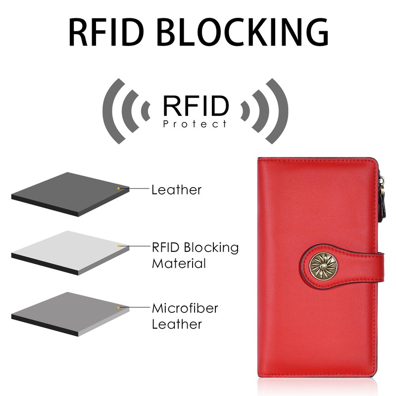 - RFID blocking wallet: Under the leather surface of this wallet, we've covered an aluminium-embroidered lining that spans the entire wallet. When the wallet is closed, all RFID signals from ID card, driver's license, and credit/debit cards (operating at a frequency of 13.56 MHz) are blocked, protecting you from digital thieves trying to steal your privacy and money. Please note that this wallet may not block some ID cards and older access cards that operate at a lower frequency of 125KHz