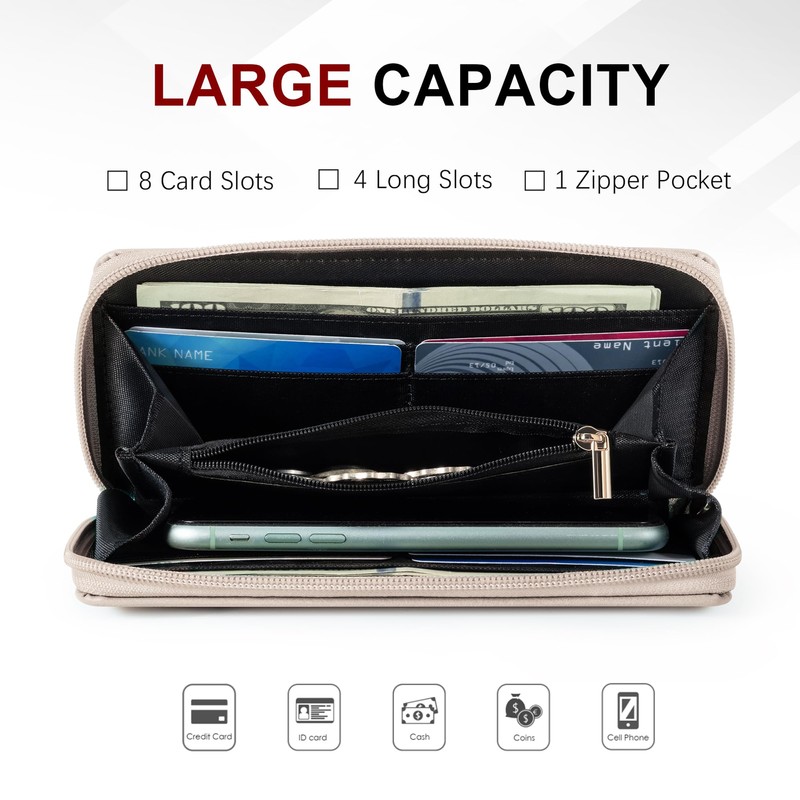 - Large Capacity: This womens wallet features 4 cash slots (which can also serve as a checkbook holder), 1 zippered exterior pocket, and 12 card slots. It also has the capacity to hold your iPhone