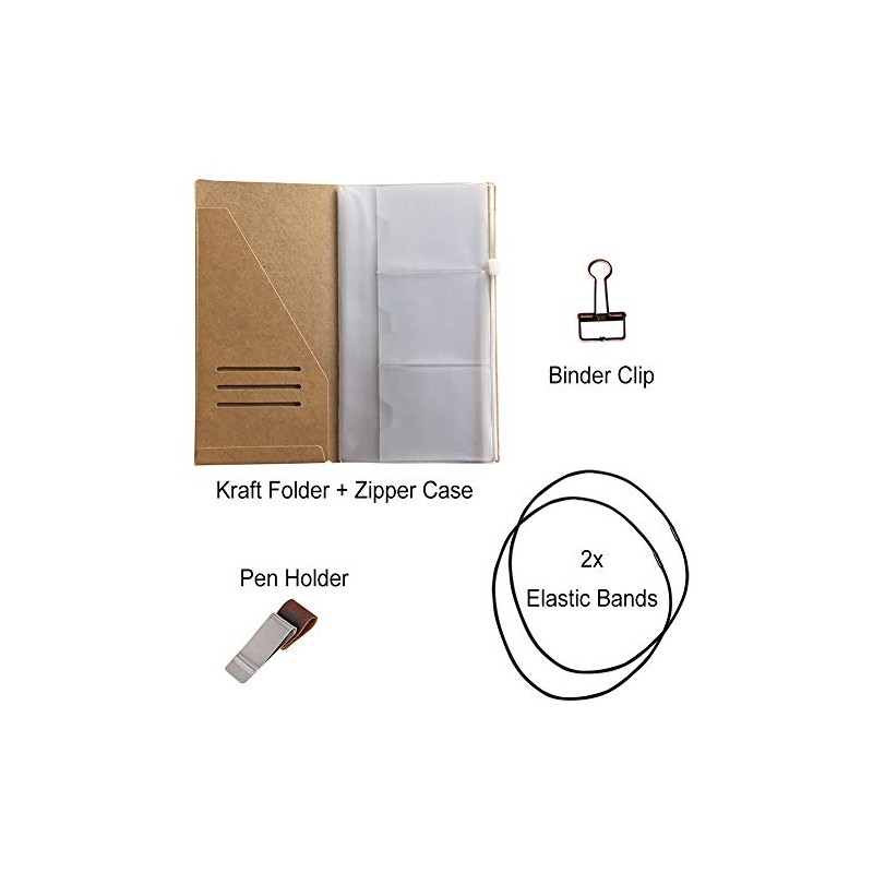 Travelers Notebook Accessories Kit - Kraft File Folder, Zipper Case, Pen Holder, Binder Clip and 2 Elastic Bands