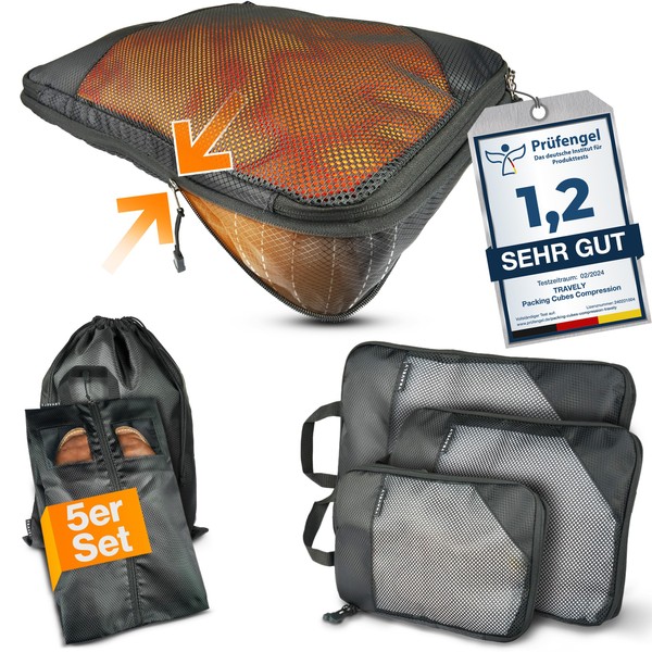 TRAVELY Packing Cubes Compression - 5-teiliges Set inkl. Schuhtasche & Wäschebeutel - Packwürfel Kompression als Koffer oder Rucksack Organizer - Packtaschen für Reise, Packbeutel, Kompressionsbeutel