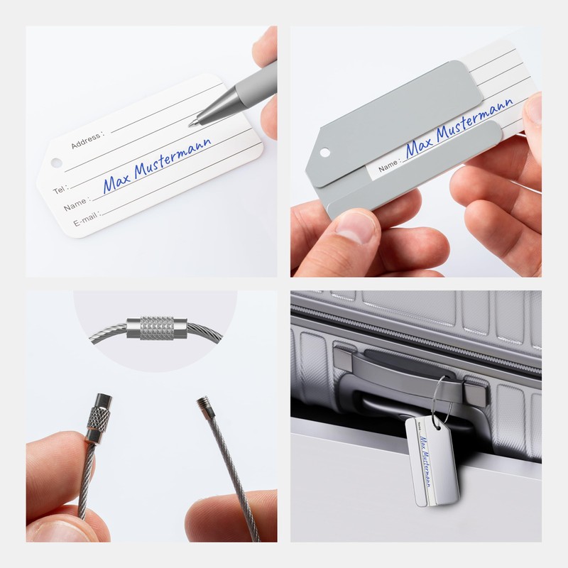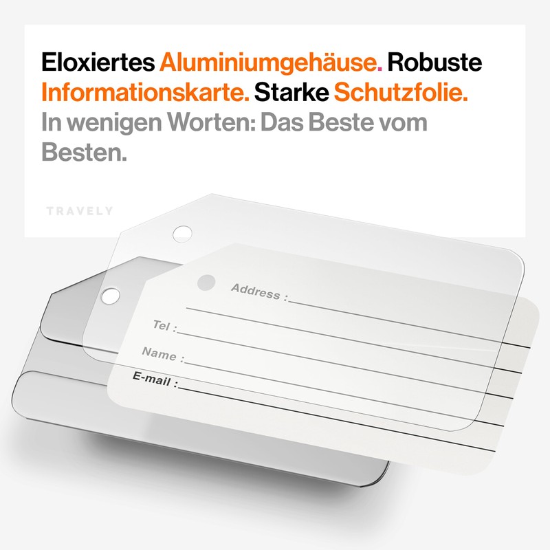- Robust and durable: High-quality aluminium housing with strong protective film and robust information card. For optimal protection, we recommend pinching the tag under the suitcase handle when checking-in luggage.