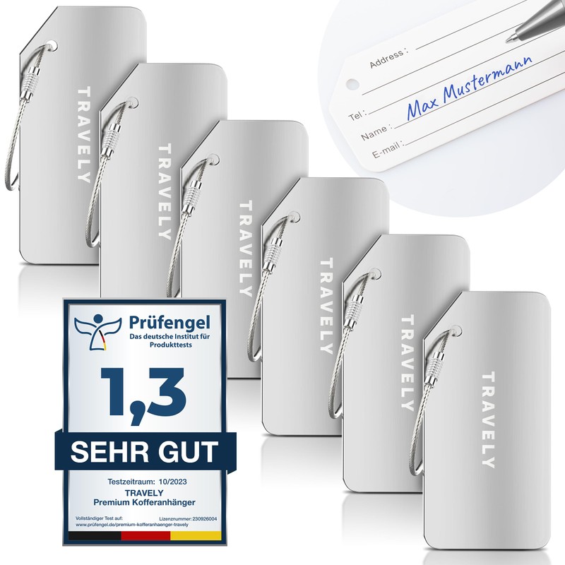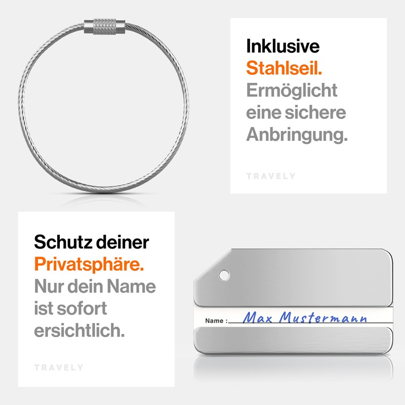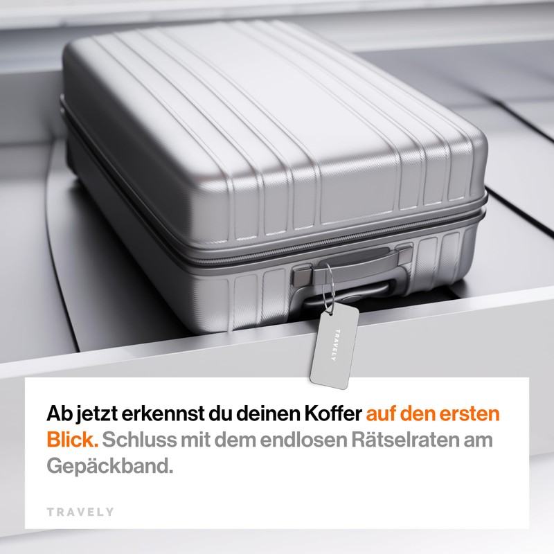 - No more lost suitcases. With the Travely luggage tag your luggage is always safe on the go. Thanks to the individually personalised name tags, your luggage is always identifiable.
