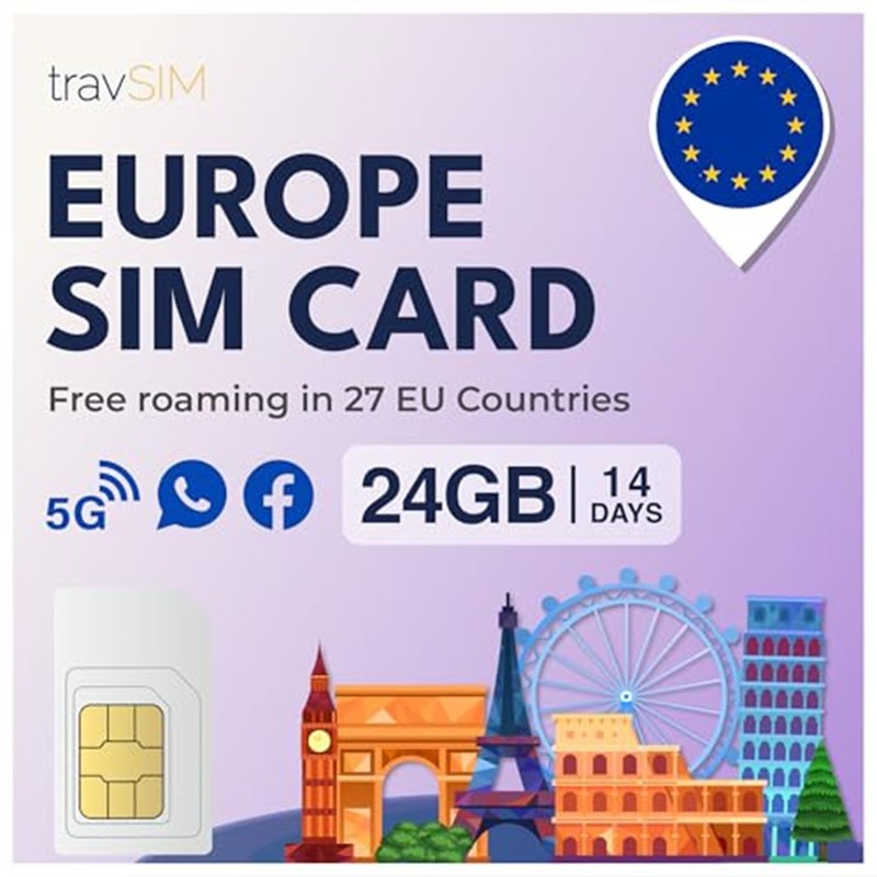travSIM Europe SIM Card with 24GB of Data (4G/5G speeds) | Valid for 14 Days | Data Only SIM Card | Use VOIP apps Like Skype and Whatsapp for Calls | Use SIM for Europe in All EU Countries