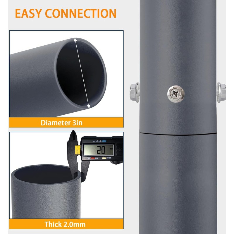 • Detachable Design - A pole that is 10 feet high is composed of 3 small poles, which can be combined to a height of 6.6 feet or 10 feet according to requirements, and the connection is reinforced with screws