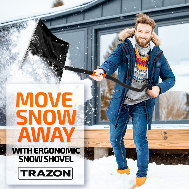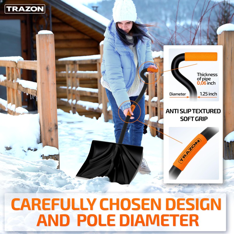 - Multi-purpose use. Clean snow faster and easier after a winter storm with this snow shovel. This item is designed to put less stress on your arms and back as you are removing snow from sidewalks and driveways to allow safe and free passage. Keep it in your garage or put it in your car as you set for camping or any other adventure