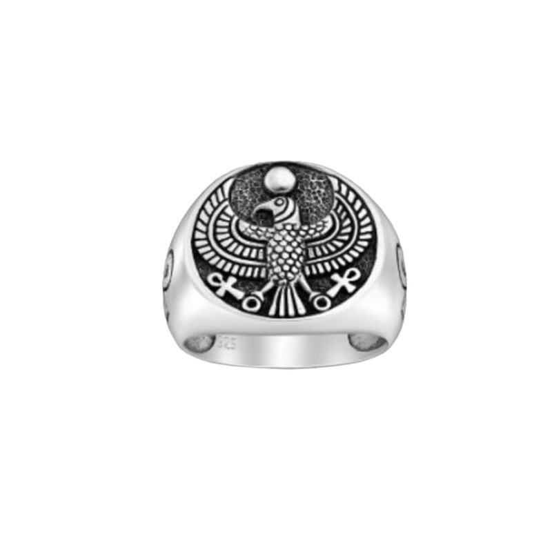 - MATERIAL: It made from 925 Sterling silver, finished in high polish. Intricate Symbolism: The ring features the powerful symbols of the Eagle, the Eye of Horus, and the Ankh, each representing protection, good health, and eternal life in ancient Egyptian culture.