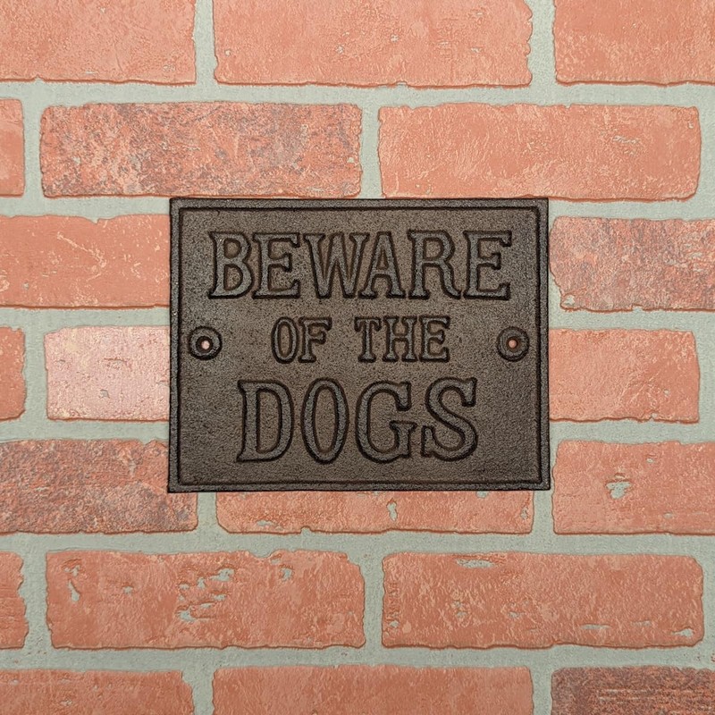 Warn your visitors, neighbors, passersby, and the mail carrier to beware of your dog with this rustic cast iron sign. Made from heavy duty cast iron, this Caution sign with embossed lettering reads: "BEWARE OF THE DOGS." Mount this heavy-duty plaque on your fence, gate, or front door to caution visitors and to add a sense of security to your domain. Give this heavy metal sign as a gift to dog-owning friends or family and let them warn others a dog is on premise. Even if your dog is the sweetest and kindest dog in the world, mail carriers and others still like to know when a dog is present, so alert them with this metal sign on your front porch. Warning Dogs sign measures 8 7/8" wide, 6 7/8" Tall and 1/4" thick, and is made from heavy cast iron. Metal Home or Garden sign ships brand new in manufacturer's packaging with our 100% customer satisfaction guarantee.