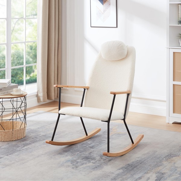 This Adjustable Headrest Pillow Rocking Chair is ideal for those seeking comfort and style. Upholstered in teddy fabric, its modern design makes it a addition to a nursery, bedroom, or living room setting. This rocking chair features a high backrest and armrest designed to prioritize ergonomic support during use, ensuring a cozy experience.