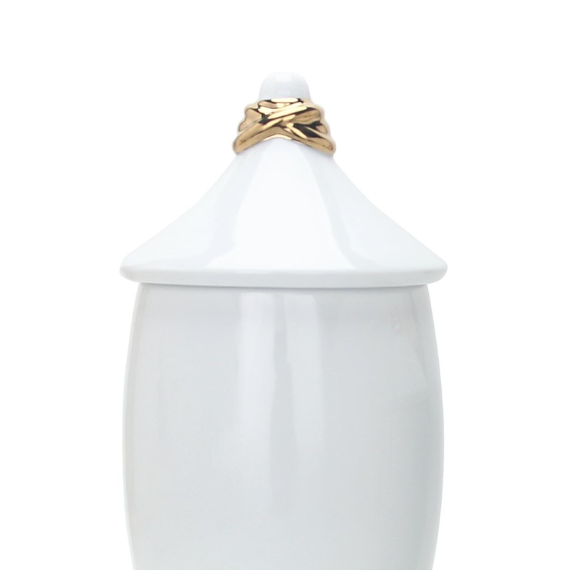 Featuring a glossy white exterior complemented by a stunning gold accent, this jar elevates the aesthetic of any room. The combination of contemporary design and practical storage makes it suitable for various home settings, including living areas, bedrooms, and bathrooms.