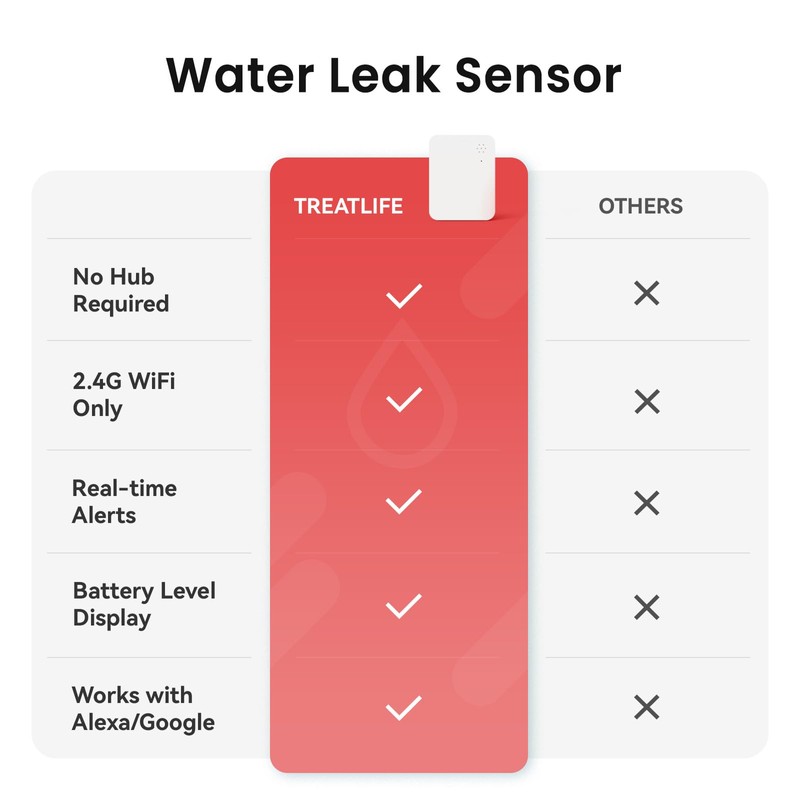 - WiFi Water Leak Detector for Home: Compatible with Alexa or Google Assistant, easily check your system's status, and battery levels, and pinpoint leaks using Treatlife App. It includes 6 AAA batteries (provided) for up to two years under normal use. Receive battery replacement reminders through the app, ensuring uninterrupted protection