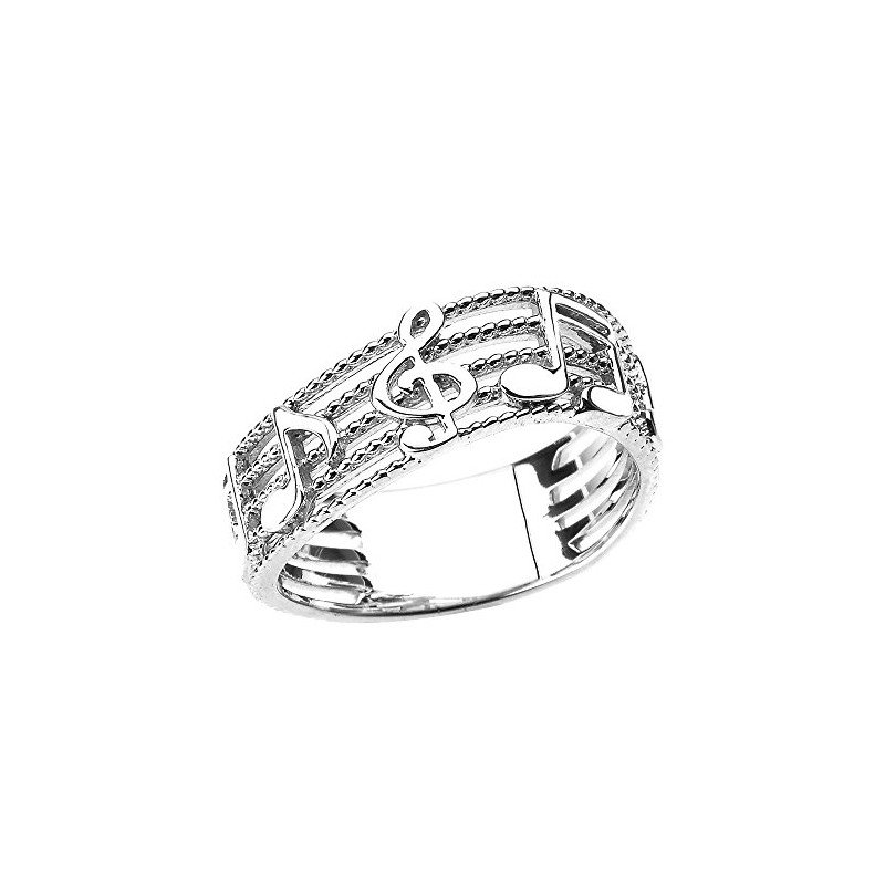 Treble Clef with Musical Notes in Sterling Silver Wavy Band (Size 8)