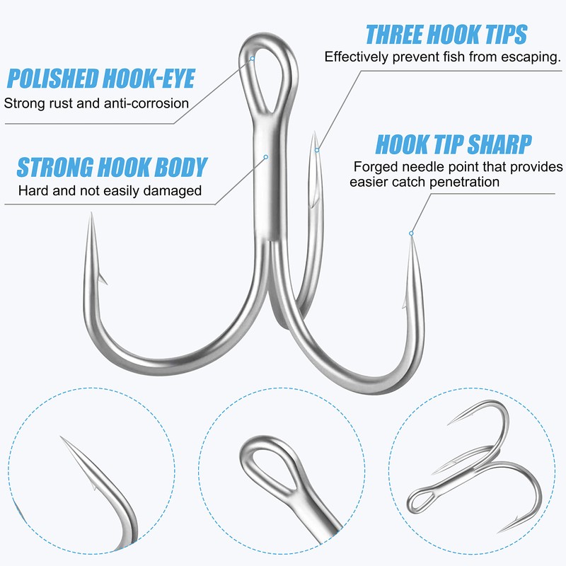 - Sharp: Treble hooks with triple super sharp needlepoint with barb, force fish into elbow and prevent fish from escaping.