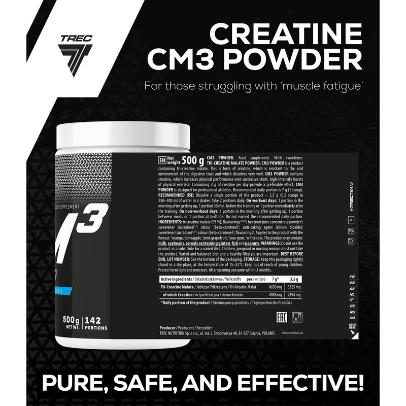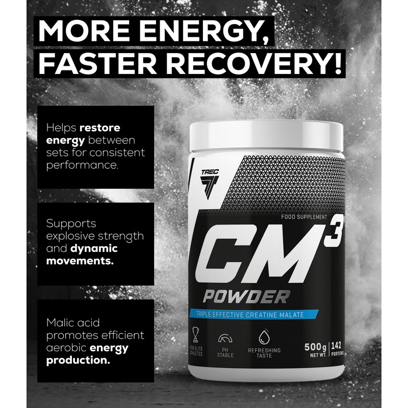 Product Description- High levels of power and energy - Soluble and stable form of creatine- Maximum dose of creatine malateCM3 is a product containing an increased dose of crystal pure Tri-Creatine Malate. This is a very stable form of creatine, which is resistant to the acid environment of the digestive tract and which dissolves very well. Unlike the simple monohydrate, Tri-Creatine Malate does not have typical side effects and its use leads to more intensive increase of strength and muscular mass. CM3 is recommended as a product which helps to achieve the top condition, especially in power as well as power and speed disciplines.IngredientsTricreatine malate (95.0%); flavours; sweetener - sucralose; beetroot juice concentrate for pink grapefruit flavour; anti-caking agent - silicon dioxide; colour for orange flavour - orange yellow FCF;Safety WarningFood supplements must not be used as a substitute for a varied and balanced diet and a healthy lifestyle. If you are pregnant, breastfeeding, taking any medications, or under medical supervision, please consult a doctor or healthcare professional before use. Store in a dry and cool place. Keep out of reach of children.
