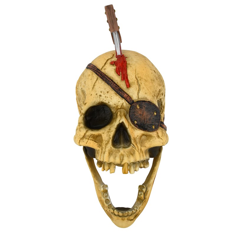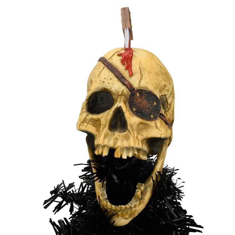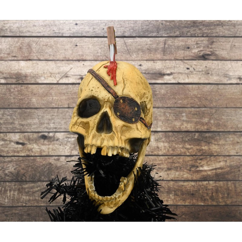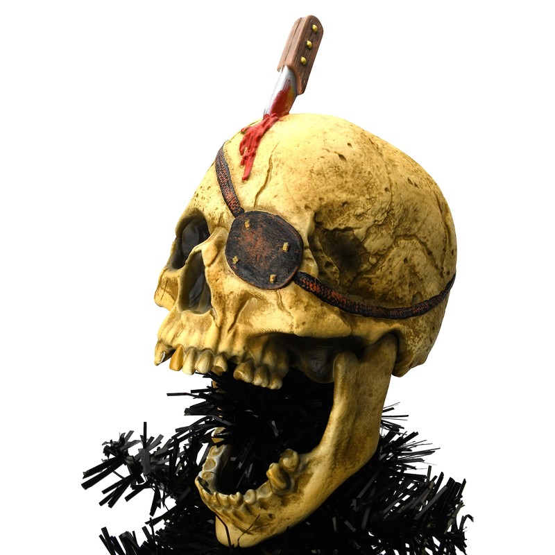 - This scary Tree topper could be used for Halloween or Christmas if you're into Pirates! The Pirate Skull décor Halloween Tree Topper is expertly hand-painted, showcasing a weathered and worn look that adds character and depth. Its realistic design captures the essence of a pirate captain, complete with a tattered eyepatch, knife and blood, and a gold tooth.