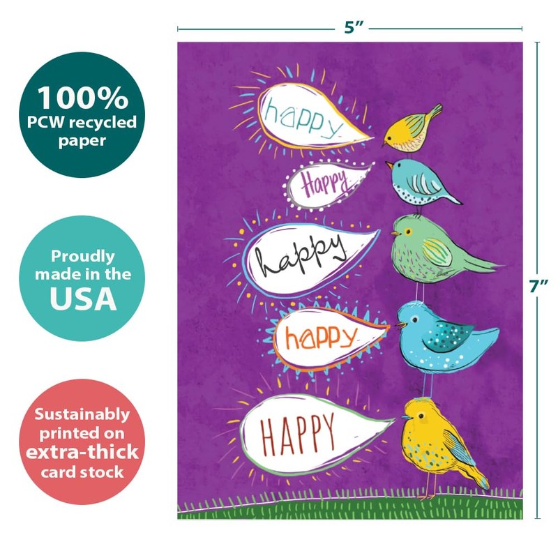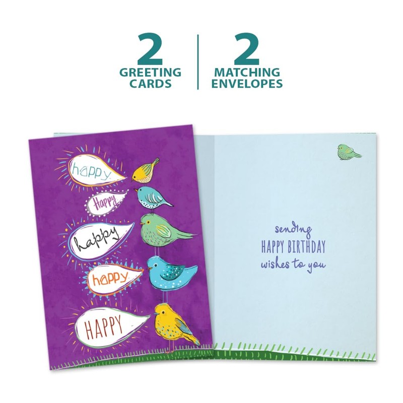 Tree-Free Greetings - Birthday Cards - Artful Designs - 2 Cards + Matching Envelopes - Made in USA - 100% Recycled Paper - 5"x7" - Happy Birds (GT65319)