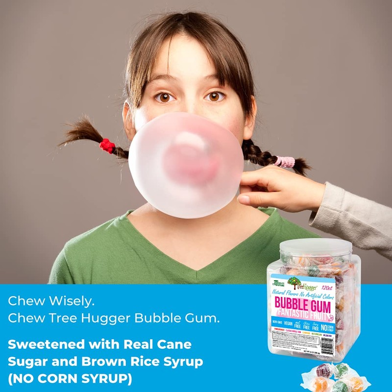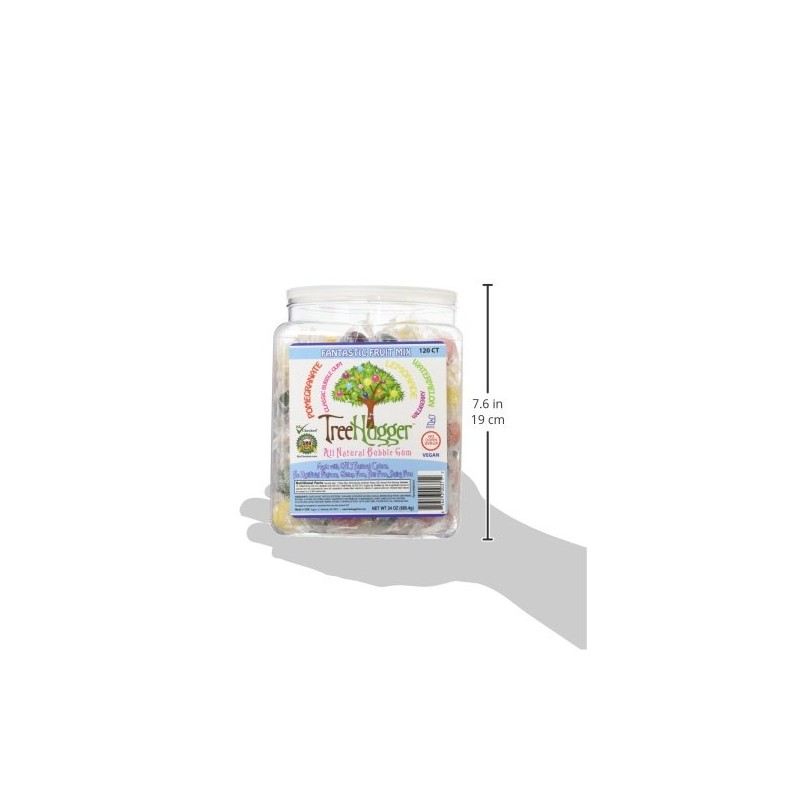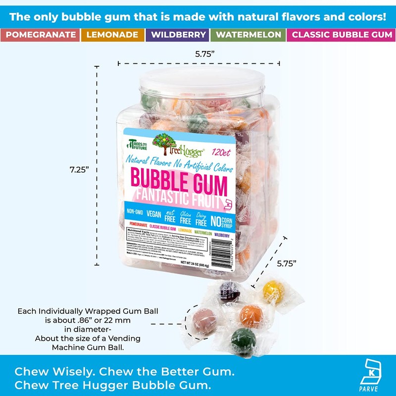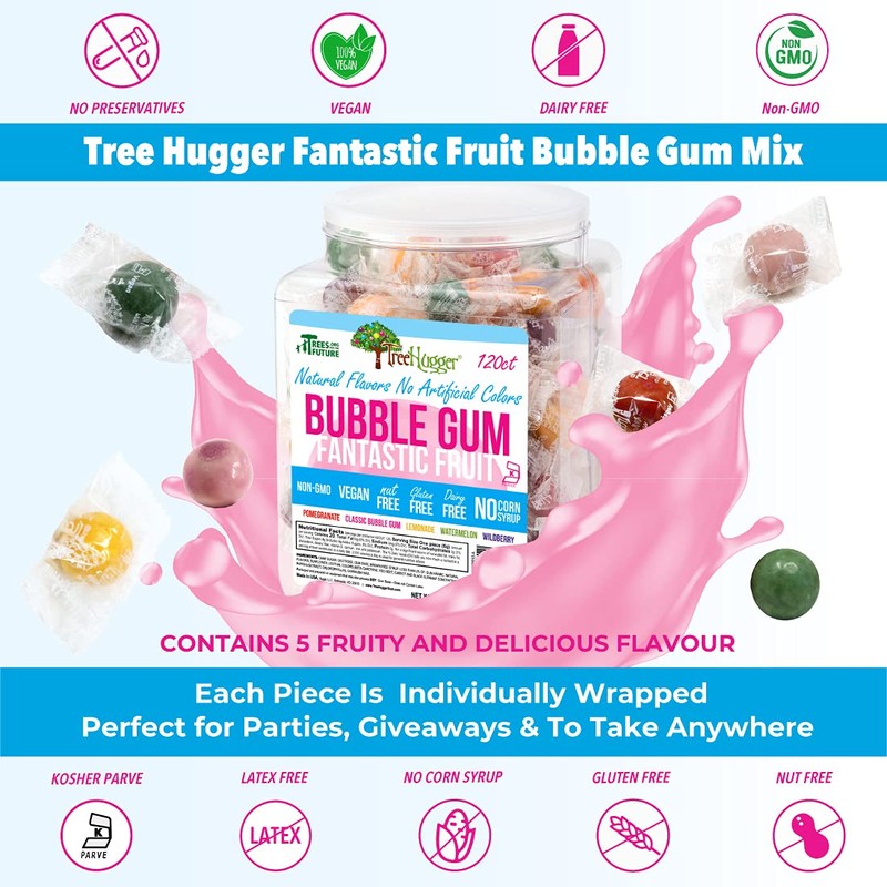 Tree Hugger is the only bubble gum made with Natural Flavors and No Artificial Colors. Fantastic Fruit comes in a wide range of fruity and delicious flavors C pomegranate, classic bubblegum, watermelon, lemonade and wild berry. Tree Hugger Bubble Gum is perfect for moms looking for great tasting classic bubble gum that is made with no artificial colors and no artificial flavors and contains only non-GMO ingredients. It has no corn syrup. Tree Hugger Bubble Gum is nut-free, dairy-free, gluten-free and is Kosher Parve and vegan. The Fantastic Fruit Bubble Gum Tub contains 120 Individually wrapped large gum balls.