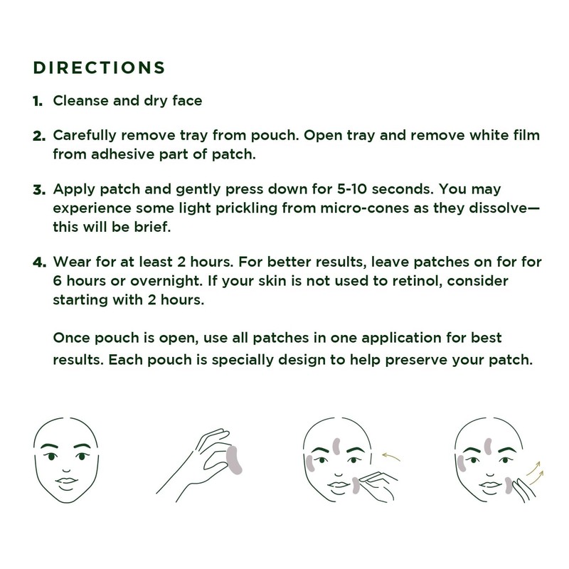 - Directions: Open tray and remove white film from adhesive part of patch. Apply patch to clean skin and gently press down for 5-10 seconds (you may experience some light prickling from micro-cones as they dissolve - this will be brief). Wear for at least 2 hours. For better results, leave patches on for 6 hours or overnight. If your skin is not used to Retinol, consider starting with 2 hours. Once pouch is open, use all patches in one application for best results.