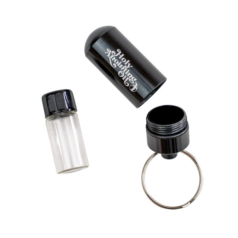 - SCREW TOP OIL CONTAINER WITH EMPTY BOTTLE: The keyring attached to the lid makes it easy to add this vial holder to any set of keys, keyrings, keychains, lanyards, or zippers. Never be unprepared to do the Lord's work with this convenient, well-protected anointing oil holder keychain.