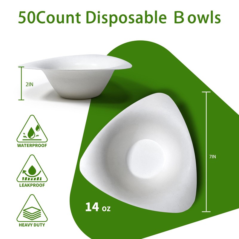 - [Fancy Design and Specifications] the disposable paper bowl features a triangular design with extended and widened edges at each corner, effectively preventing food spillage and keeping your hands clean. The top diameter of the bowl is 7 inches, its height is 2 inches, and it has a capacity of 14 ounces—an ideal size for storing various types of food.