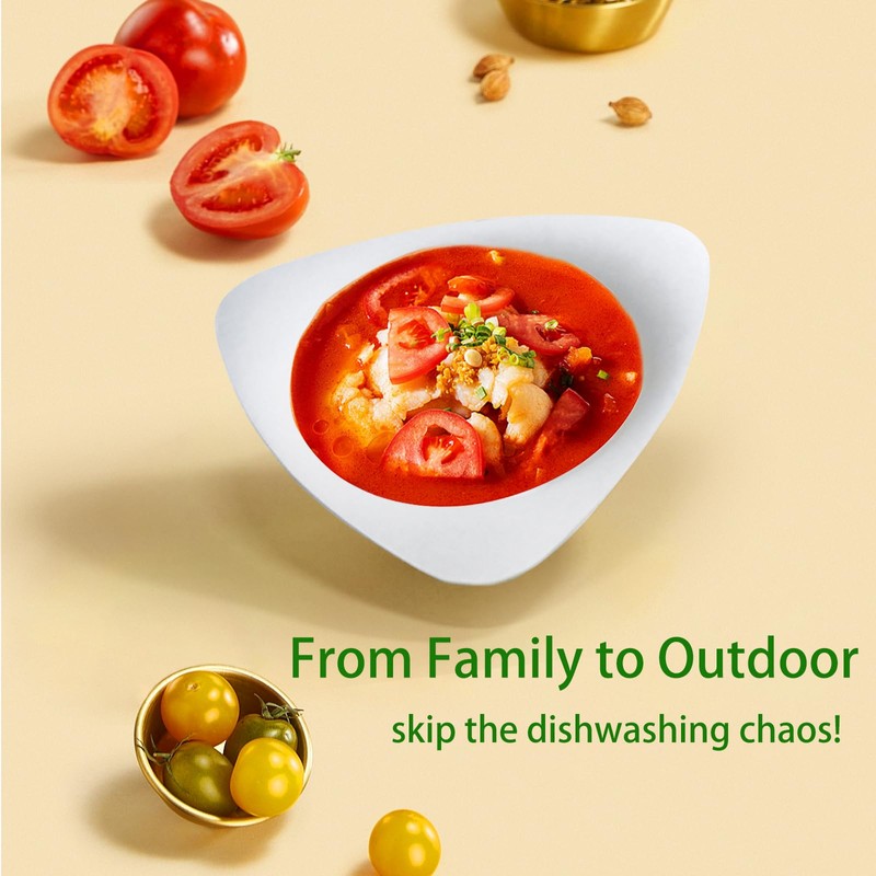 - [Eco-Friendly Material and Safety] Our disposable paper bowls are made from natural bagasse, ensuring they are free from plastic and BPA. The bulk paper bowl without irritating taste and comply with FDA food safety standards, allowing you to use them with confidence. Additionally, these disposable bowls meet compostability criteria, enabling them to return to nature within 3-6 months. Not only convenient handling also will not harm the environment.