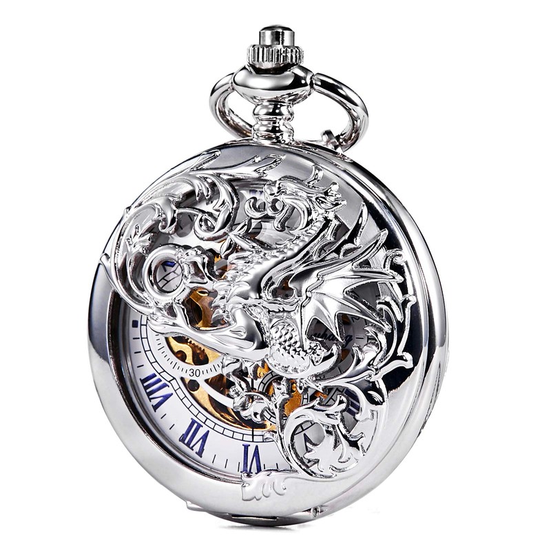 TREEWETO Mechanical Pocket Watch - Dream Dragon Skeleton Half Hunter Double Open Silver Case