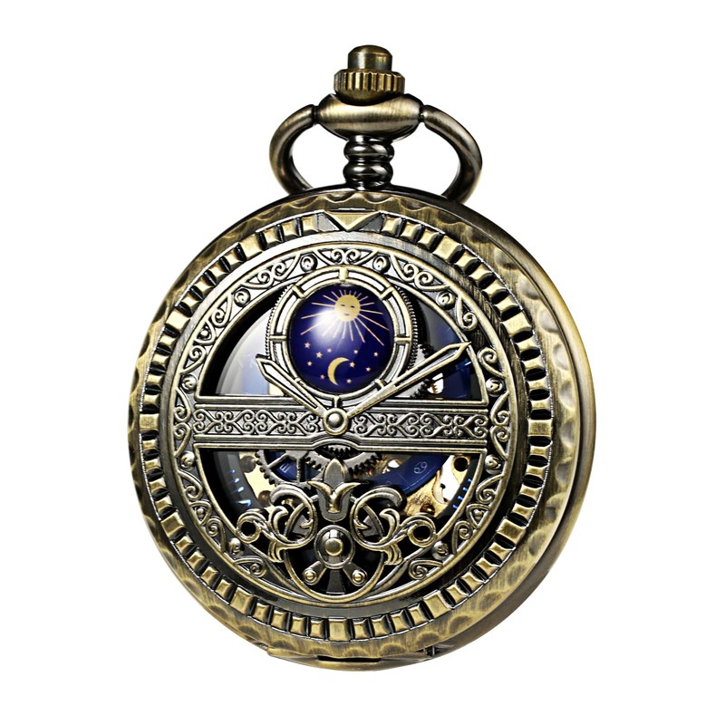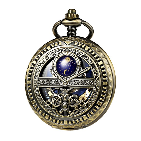 TREEWETO Men's Mechanical Roman Numerals Dial Sun and Moon Skeleton Bronze Case Pocket Watches with Box and Chains for Mens Women