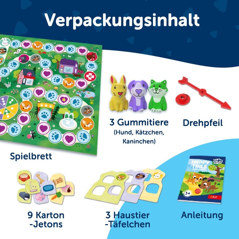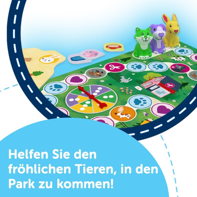 - The set includes: a game board, 3 rubber animals, 3 pet boards, 9 cardboard chips, a rotating arrow, instructions (English language not guaranteed)
