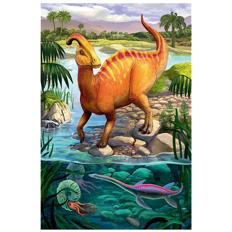 • The puzzle set consists of 54 elements and allows you to create an extremely colourful picture with dinosaurs.