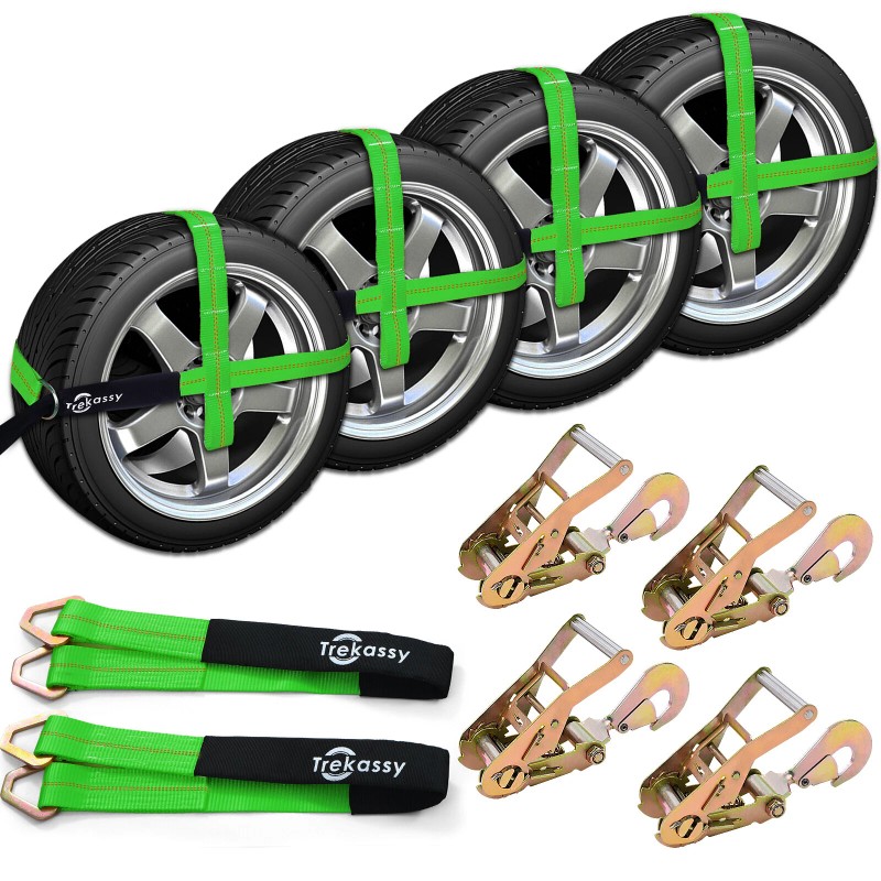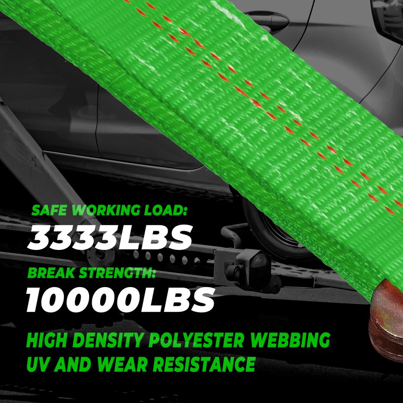 【Durable & Heavy Duty】 These wheel tie down straps are 2" wide coverage for less friction and made of industrial grade polyester material coating UV and wear resistance.Lab test with safe working load of 3333 lbs and break strength of 10,000 lbs.