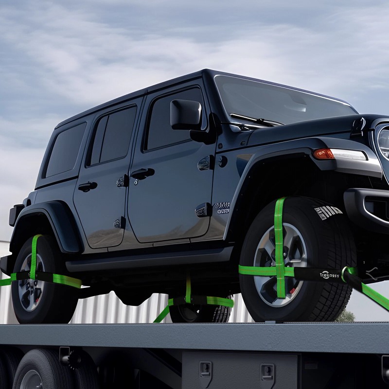 【Fit All Size Tires】 Adjustable 6 loops strap, 10ft lasso strap with smooth D-ring is perfect for all size tires, easy and safe to fasten cars, trucks, jeeps and more. A good fit for long hauls.