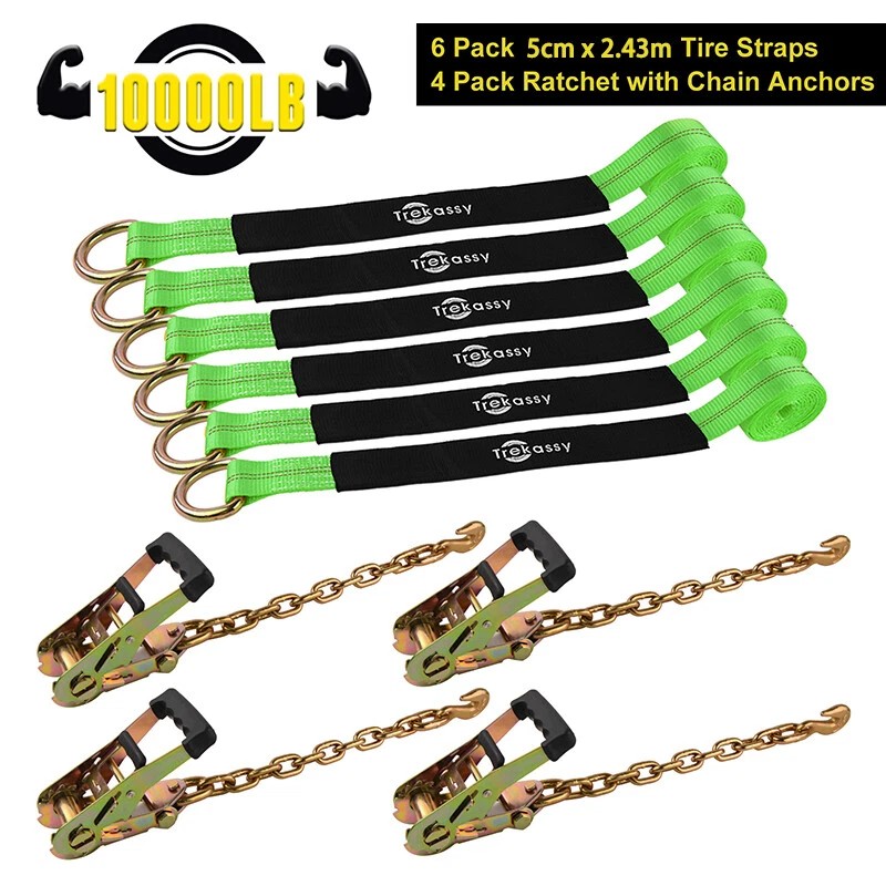 Durable and Heavy Duty with 3,333LBS Safe Working LoadTrekassy wheel straps are 2" wide coverage for less friction and made of industrial grade polyester material coating UV and wear resistance.Lab test with safe working load of 3333 lbs and break strength of 10,000 lbs. |