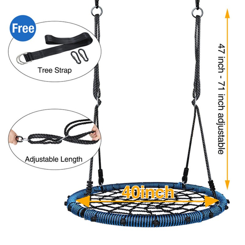 DURABLE NET TREE SWING:Extra 71 inch long 12mm thick ropes are made from high quality PE webbing with metal rings for secured fastening. Adjustable length between 47 and 71 inch. Strong UV resistant and won't fade for years.