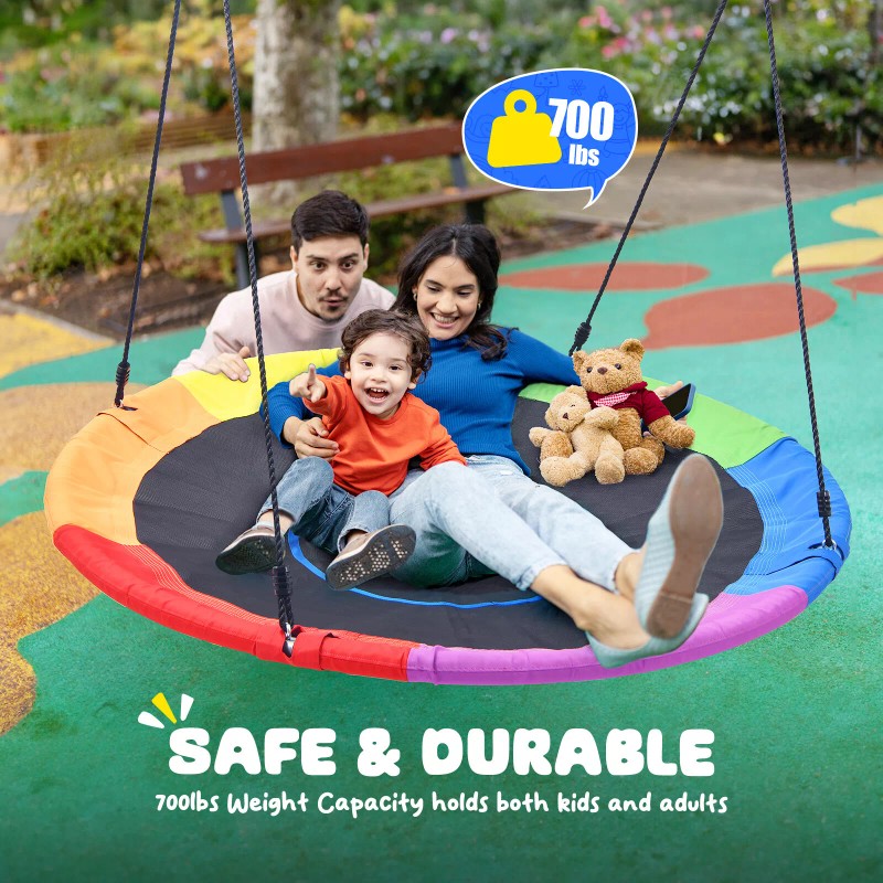 Large saucer swing for adults: Large 60" steel frame, 700lbs high weight capacity can accommodate both kids and adults comfortably at the same time. The whole family can have fun together on this big swingBig round swing: Sit, lie, stand or surf on this big saucer swing for adults and enjoy the swing fun anywhere you want. You can install our disk swing indoor, outdoor or in a playground, backyard, park, or hang it on a swing set, tree, playset and moreUpgraded cricle swing seat: Made of high quality material, the large round swing seat is wear-resistant,UV-resistant, lasts for many seasons of playDurable hanging ropes: Extra thick ropes are made from high quality PE webbing with metal rings for secured fastening. You can adjust the rope length to adapt to your hanging heightHassle-fre