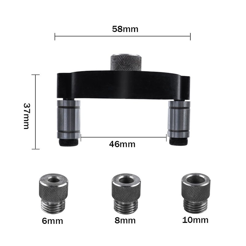 - Sizes of dowel template - diameter: 58 mm, height: 37 mm, integrated drill guides: 6 mm/8 mm/10 mm, compatible with wooden panels under 46 mm diameter.