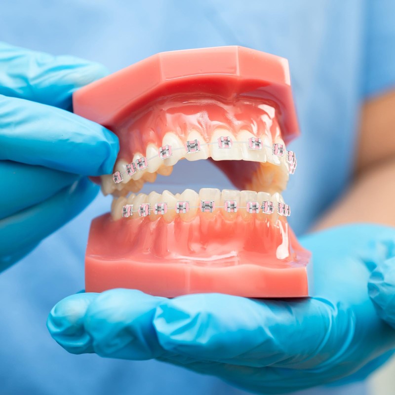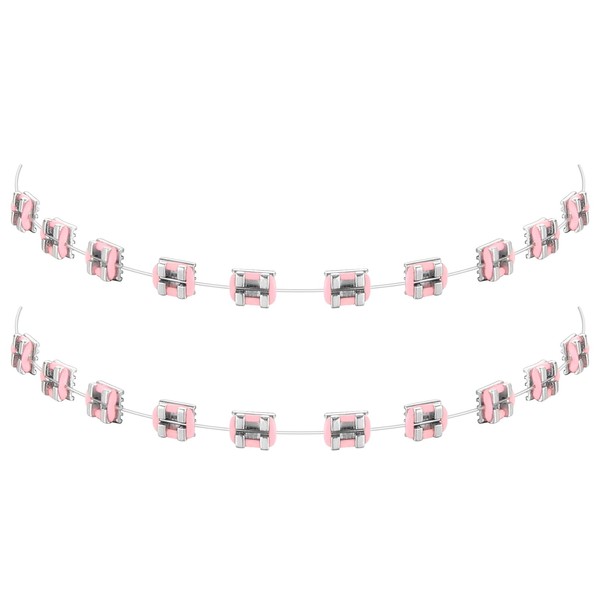 TrelaCo 1 Pack Fake Braces Artificial Tooth Decoration with Metal Wires Metal Bracket and Orthodontic Ligature Ties Practice Props for Dental Students Orthodontist Explain Props(Pink,Without Hook)
