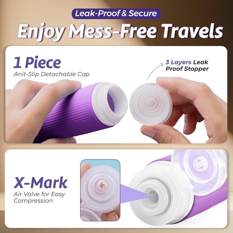 Each bottle capacity: 3oz travel bottles Bottle color: Apricot Material used: High-quality silicone and PP Package includes: Set of 5 bottles in one pack + Stickers + EVA material zipper BAG Traveling can often mean juggling small containers and battling with leaky caps, but with Trellv’s TSA travel containers for toiletries, those days are over. These travel size toiletries women are thoughtfully designed with a generous 3 oz capacity, adhering strictly to TSA standards to ensure they can accompany you through airport security without a hitch. Each travel squeeze bottle is equipped with an innovative 'X' Mark Air Valve, a cutting-edge feature that prevents air-induced leaks, protecting your essentials from the pressure changes typical in flights. The real beauty of these refillable travel bottles lies in their construction. Made from high-grade, non-BPA silicon and PP materials, they offer both durability and safety, ensuring that whatever you fill them with remains in pristine condition. Whether its lotions, shampoos, or even food items like salad dressings, these silicone travel containers handle it all with ease. The materials are not only durable but also soft and squeezable, which means you can get every last drop of your product without any waste. For those who dread the mess and fuss of refilling travel bottles, Trellv has engineered a solution. Each silicone squeeze bottle features a wide opening that greatly simplifies the refilling process, even for thicker liquids like creams and gels. This design not only facilitates easy filling but also ensures thorough cleaning, leaving no residue or odor behind. With Trellv’s travel bottle set, you can pack smart, travel light, and keep your toiletries perfectly organized and accessible, making your travel experiences as seamless and enjoyable as possible.
