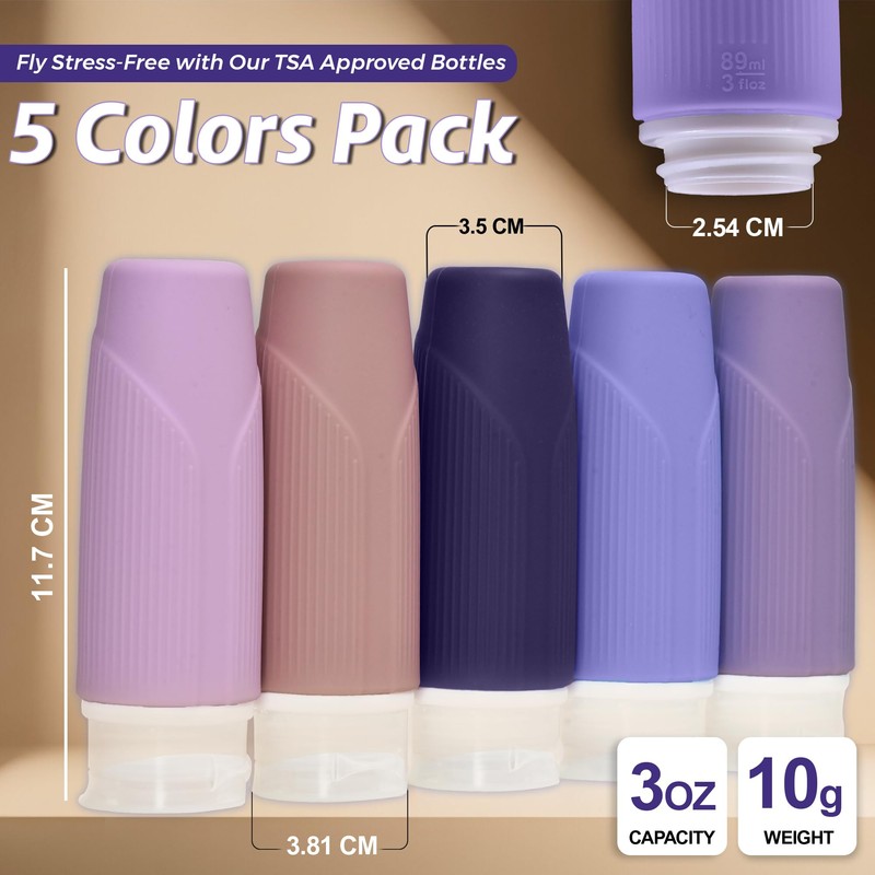 Trellv 3 Oz Silicone Travel Bottles for Toiletries - Set of 5 TSA Approved Travel Bottles Leak Proof & Squeezable - Toiletry Bottles with Zipper Bag & Stickers for Shampoo Conditioner Lotion (Purple)