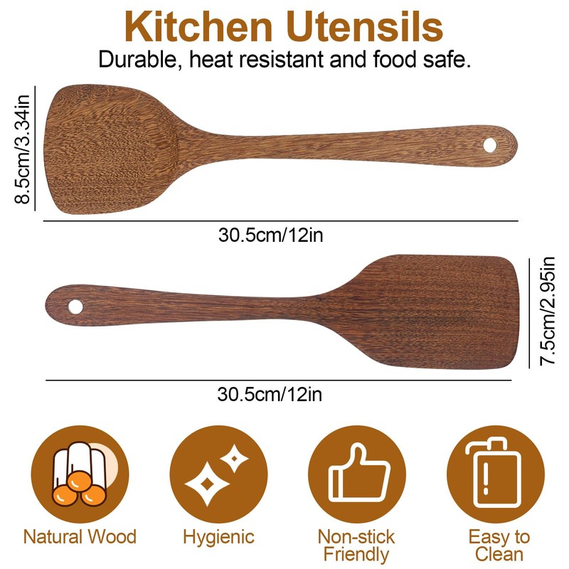 - Box contents: wooden spatula set: 1 x wide spatula, 30 x 8.5 x 0.6 cm; 1 x narrow spatula, 30 x 7.5 x 0.52 cm; the cooking cutlery set is suitable for coated pans as well as for woks and stainless steel pots.