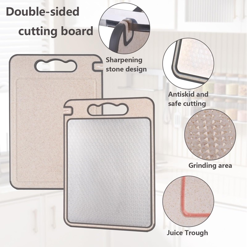 - DOUBLE SIDED DESIGN FOR VERSATILITY Stainless steel side for meat and seafood, wheat straw side for fruits, vegetables and bread. Titanium cutting board pore-free design prevents odor absorption and cross contamination. So cutting board keeps your preparation hygienic and practical.