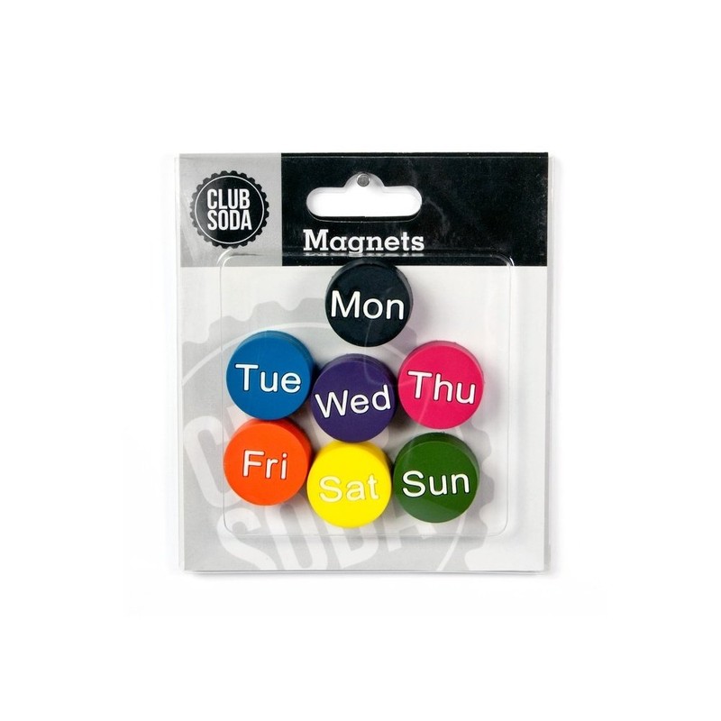 - Each magnet displays a day of the week in white text from the colored rubber - each magnet holds six sheets of A4 paper on a bulletin board or fridge