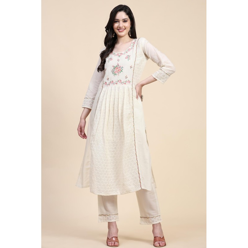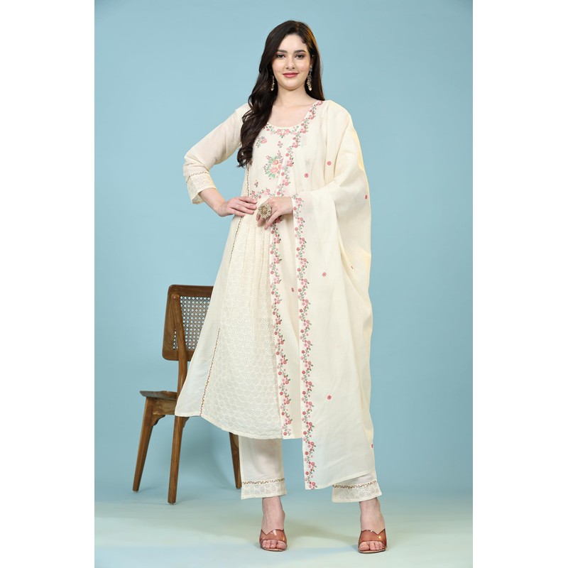 TRENDMALLS Women's Schiffli Pure Cotton Embroidery Salwar Suit Set Kurta Pant with Dupatta (G156-Offwhite-S)